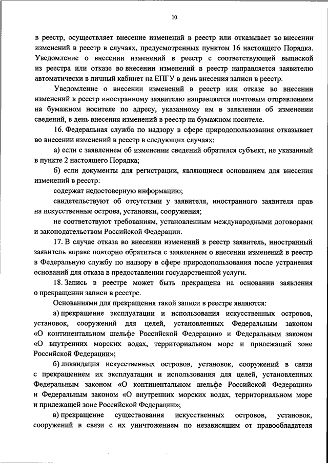 "ОБ УТВЕРЖДЕНИИ ПОРЯДКА РЕГИСТРАЦИИ ИСКУССТВЕННЫХ ОСТРОВОВ, УСТАНОВОК, СООРУЖЕНИЙ, РАСПОЛОЖЕННЫХ НА КОНТИНЕНТАЛЬНОМ ШЕЛЬФЕ РОССИЙСКОЙ ФЕДЕРАЦИИ, И ПРАВ НА НИХ, ИСКУССТВЕННЫХ ОСТРОВОВ, УСТАНОВОК, СООРУЖЕНИЙ (ЗА ИСКЛЮЧЕНИЕМ ПЛАВУЧИХ (ПОДВИЖНЫХ) БУРОВЫХ УСТАНОВОК (ПЛАТФОРМ), МОРСКИХ ПЛАВУЧИХ (ПЕРЕДВИЖНЫХ) ПЛАТФОРМ), РАСПОЛОЖЕННЫХ ВО ВНУТРЕННИХ МОРСКИХ ВОДАХ РОССИЙСКОЙ ФЕДЕРАЦИИ, В ТЕРРИТОРИАЛЬНОМ МОРЕ РОССИЙСКОЙ ФЕДЕРАЦИИ И В ПРЕДЕЛАХ РОССИЙСКОГО СЕКТОРА КАСПИЙСКОГО МОРЯ, И ПРАВ НА НИХ В РЕЕСТРЕ ИСКУССТВЕННЫХ ОСТРОВОВ, УСТАНОВОК, СООРУЖЕНИЙ И ПРАВ НИХ, А ТАКЖЕ ВНЕСЕНИЯ В НЕГО ИНФОРМАЦИИ ОБ ИЗМЕНЕНИИ СВЕДЕНИЙ О РАНЕЕ ЗАРЕГИСТРИРОВАННЫХ УКАЗАННЫХ ИСКУССТВЕННЫХ ОСТРОВАХ, УСТАНОВКАХ, СООРУЖЕНИЯХ И ПРАВАХ НА НИХ, О ПРЕКРАЩЕНИИ ЗАПИСИ И ОБ ИСПРАВЛЕНИИ В НЕМ ТЕХНИЧЕСКИХ ОШИБОК ЛИБО ОТКАЗА В ОСУЩЕСТВЛЕНИИ УКАЗАННЫХ ПРОЦЕДУР, А ТАКЖЕ ПРЕДОСТАВЛЕНИЯ ИЗ УКАЗАННОГО РЕЕСТРА СВЕДЕНИЙ"