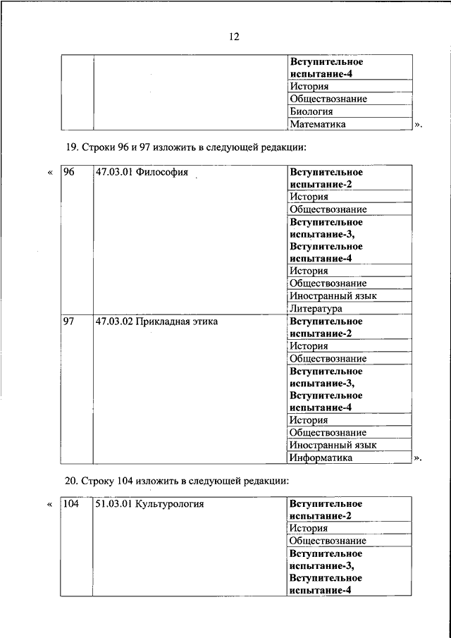 "О ВНЕСЕНИИ ИЗМЕНЕНИЙ В ПЕРЕЧЕНЬ ВСТУПИТЕЛЬНЫХ ИСПЫТАНИЙ ПРИ