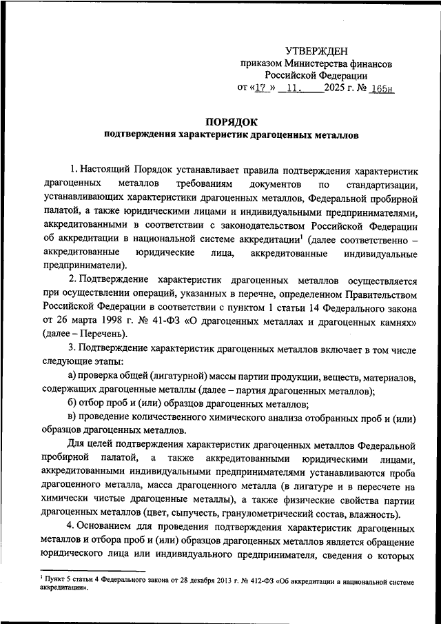 "ОБ УТВЕРЖДЕНИИ ПОРЯДКА ПОДТВЕРЖДЕНИЯ ХАРАКТЕРИСТИК ДРАГОЦЕННЫХ МЕТАЛЛОВ"