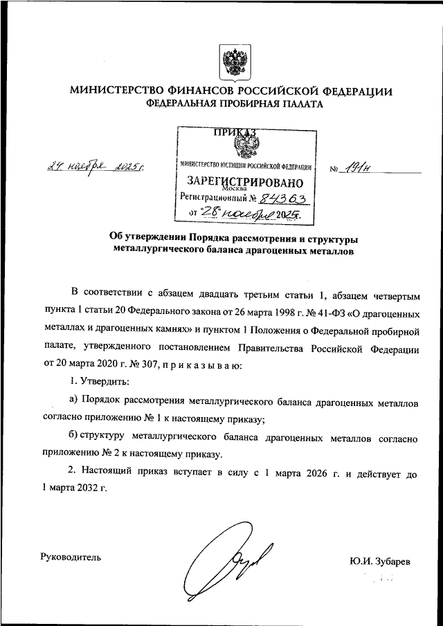 ПРИКАЗ Федеральной пробирной палаты от 24.11.2025 N 191н