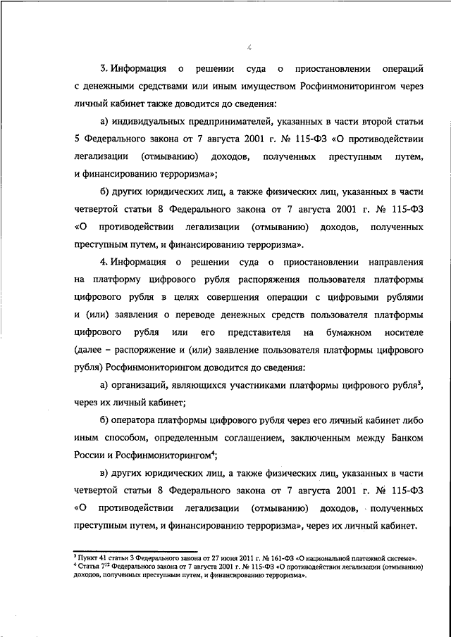 "ОБ УТВЕРЖДЕНИИ ПОРЯДКА И СРОКОВ ДОВЕДЕНИЯ ФЕДЕРАЛЬНОЙ СЛУЖБОЙ ПО ФИНАНСОВОМУ МОНИТОРИНГУ ДО СВЕДЕНИЯ ОРГАНИЗАЦИЙ, ОСУЩЕСТВЛЯЮЩИХ ОПЕРАЦИИ С ДЕНЕЖНЫМИ СРЕДСТВАМИ ИЛИ ИНЫМ ИМУЩЕСТВОМ, ОПЕРАТОРА ПЛАТФОРМЫ ЦИФРОВОГО РУБЛЯ, ДРУГИХ ЮРИДИЧЕСКИХ ЛИЦ, А ТАКЖЕ ФИЗИЧЕСКИХ ЛИЦ ИНФОРМАЦИИ О РЕШЕНИИ СУДА О ПРИОСТАНОВЛЕНИИ ОПЕРАЦИЙ С ДЕНЕЖНЫМИ СРЕДСТВАМИ ИЛИ ИНЫМ ИМУЩЕСТВОМ, ПРИОСТАНОВЛЕНИИ НАПРАВЛЕНИЯ НА ПЛАТФОРМУ ЦИФРОВОГО РУБЛЯ РАСПОРЯЖЕНИЯ ПОЛЬЗОВАТЕЛЯ ПЛАТФОРМЫ ЦИФРОВОГО РУБЛЯ В ЦЕЛЯХ СОВЕРШЕНИЯ ОПЕРАЦИИ С ЦИФРОВЫМИ РУБЛЯМИ И (ИЛИ) ЗАЯВЛЕНИЯ О ПЕРЕВОДЕ ДЕНЕЖНЫХ СРЕДСТВ ПОЛЬЗОВАТЕЛЯ ПЛАТФОРМЫ ЦИФРОВОГО РУБЛЯ ИЛИ ЕГО ПРЕДСТАВИТЕЛЯ НА БУМАЖНОМ НОСИТЕЛЕ"