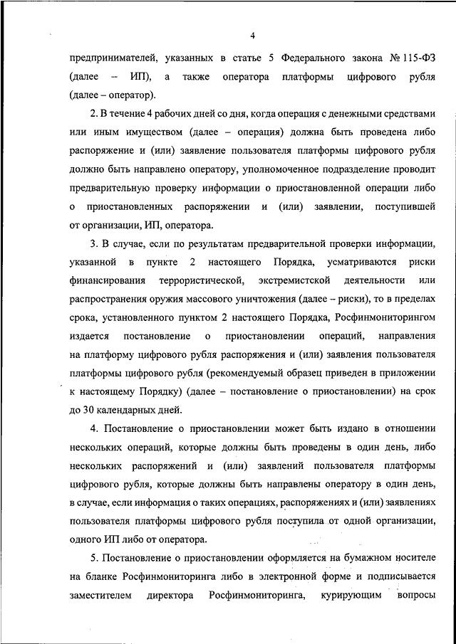 "ОБ УТВЕРЖДЕНИИ ПОРЯДКА ИЗДАНИЯ ФЕДЕРАЛЬНОЙ СЛУЖБОЙ ПО ФИНАНСОВОМУ МОНИТОРИНГУ ПОСТАНОВЛЕНИЯ О ПРИОСТАНОВЛЕНИИ ОПЕРАЦИЙ С ДЕНЕЖНЫМИ СРЕДСТВАМИ ИЛИ ИНЫМ ИМУЩЕСТВОМ, НАПРАВЛЕНИЯ НА ПЛАТФОРМУ ЦИФРОВОГО РУБЛЯ РАСПОРЯЖЕНИЯ ПОЛЬЗОВАТЕЛЯ ПЛАТФОРМЫ ЦИФРОВОГО РУБЛЯ В ЦЕЛЯХ СОВЕРШЕНИЯ ОПЕРАЦИИ С ЦИФРОВЫМИ РУБЛЯМИ И (ИЛИ) ЗАЯВЛЕНИЯ О ПЕРЕВОДЕ ДЕНЕЖНЫХ СРЕДСТВ ПОЛЬЗОВАТЕЛЯ ПЛАТФОРМЫ ЦИФРОВОГО РУБЛЯ ИЛИ ЕГО ПРЕДСТАВИТЕЛЯ НА БУМАЖНОМ НОСИТЕЛЕ, ВКЛЮЧАЯ ЕГО ОБРАЗЕЦ, И ДОВЕДЕНИЯ УКАЗАННОГО ПОСТАНОВЛЕНИЯ ДО ОРГАНИЗАЦИЙ, ОСУЩЕСТВЛЯЮЩИХ ОПЕРАЦИИ С ДЕНЕЖНЫМИ СРЕДСТВАМИ ИЛИ ИНЫМ ИМУЩЕСТВОМ, ОПЕРАТОРА ПЛАТФОРМЫ ЦИФРОВОГО РУБЛЯ"
