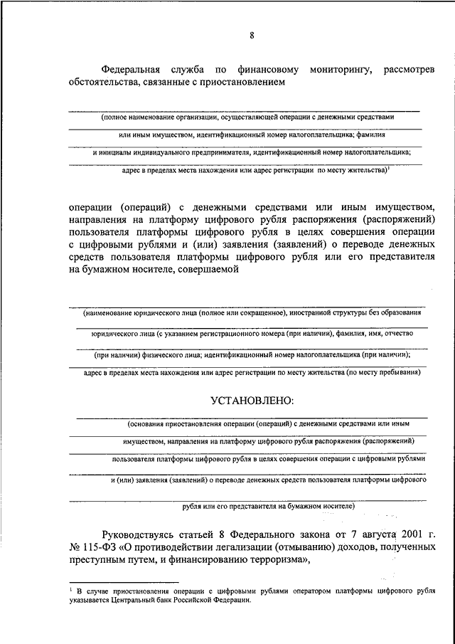 "ОБ УТВЕРЖДЕНИИ ПОРЯДКА ИЗДАНИЯ ФЕДЕРАЛЬНОЙ СЛУЖБОЙ ПО ФИНАНСОВОМУ МОНИТОРИНГУ ПОСТАНОВЛЕНИЯ О ПРИОСТАНОВЛЕНИИ ОПЕРАЦИЙ С ДЕНЕЖНЫМИ СРЕДСТВАМИ ИЛИ ИНЫМ ИМУЩЕСТВОМ, НАПРАВЛЕНИЯ НА ПЛАТФОРМУ ЦИФРОВОГО РУБЛЯ РАСПОРЯЖЕНИЯ ПОЛЬЗОВАТЕЛЯ ПЛАТФОРМЫ ЦИФРОВОГО РУБЛЯ В ЦЕЛЯХ СОВЕРШЕНИЯ ОПЕРАЦИИ С ЦИФРОВЫМИ РУБЛЯМИ И (ИЛИ) ЗАЯВЛЕНИЯ О ПЕРЕВОДЕ ДЕНЕЖНЫХ СРЕДСТВ ПОЛЬЗОВАТЕЛЯ ПЛАТФОРМЫ ЦИФРОВОГО РУБЛЯ ИЛИ ЕГО ПРЕДСТАВИТЕЛЯ НА БУМАЖНОМ НОСИТЕЛЕ, ВКЛЮЧАЯ ЕГО ОБРАЗЕЦ, И ДОВЕДЕНИЯ УКАЗАННОГО ПОСТАНОВЛЕНИЯ ДО ОРГАНИЗАЦИЙ, ОСУЩЕСТВЛЯЮЩИХ ОПЕРАЦИИ С ДЕНЕЖНЫМИ СРЕДСТВАМИ ИЛИ ИНЫМ ИМУЩЕСТВОМ, ОПЕРАТОРА ПЛАТФОРМЫ ЦИФРОВОГО РУБЛЯ"
