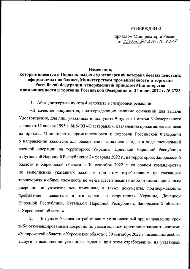 "О ВНЕСЕНИИ ИЗМЕНЕНИЙ В ПОРЯДОК ВЫДАЧИ УДОСТОВЕРЕНИЙ ВЕТЕРАНА БОЕВЫХ ДЕЙСТВИЙ, ОФОРМЛЯЕМЫХ НА БЛАНКЕ, МИНИСТЕРСТВОМ ПРОМЫШЛЕННОСТИ И ТОРГОВЛИ РОССИЙСКОЙ ФЕДЕРАЦИИ, УТВЕРЖДЕННЫЙ ПРИКАЗОМ МИНИСТЕРСТВА ПРОМЫШЛЕННОСТИ И ТОРГОВЛИ РОССИЙСКОЙ ФЕДЕРАЦИИ ОТ 24 ИЮНЯ 2024 Г. N 2783"