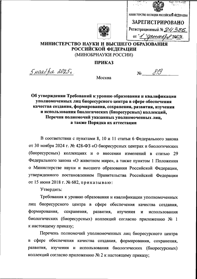 ПРИКАЗ Минобрнауки РФ от 05.11.2025 N 819