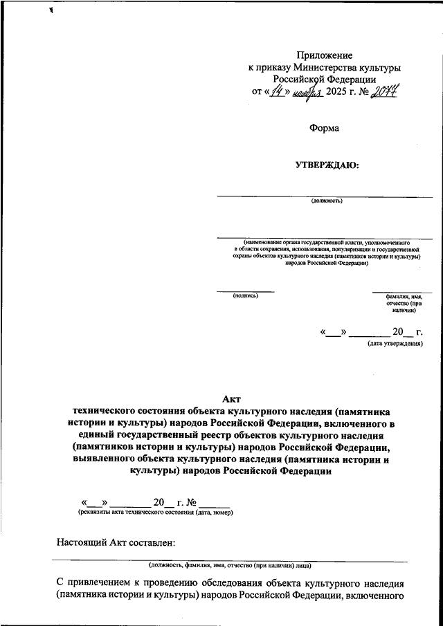 "ОБ УТВЕРЖДЕНИИ ФОРМЫ АКТА ТЕХНИЧЕСКОГО СОСТОЯНИЯ ОБЪЕКТА КУЛЬТУРНОГО НАСЛЕДИЯ (ПАМЯТНИКА ИСТОРИИ И КУЛЬТУРЫ) НАРОДОВ РОССИЙСКОЙ ФЕДЕРАЦИИ, ВКЛЮЧЕННОГО В ЕДИНЫЙ ГОСУДАРСТВЕННЫЙ РЕЕСТР ОБЪЕКТОВ КУЛЬТУРНОГО НАСЛЕДИЯ (ПАМЯТНИКОВ ИСТОРИИ И КУЛЬТУРЫ) НАРОДОВ РОССИЙСКОЙ ФЕДЕРАЦИИ, ВЫЯВЛЕННОГО ОБЪЕКТА КУЛЬТУРНОГО НАСЛЕДИЯ (ПАМЯТНИКА ИСТОРИИ И КУЛЬТУРЫ) НАРОДОВ РОССИЙСКОЙ ФЕДЕРАЦИИ"
