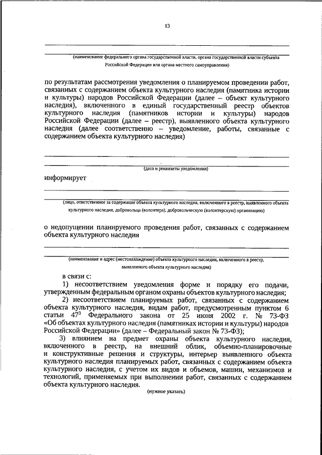 "ОБ УТВЕРЖДЕНИИ ФОРМЫ УВЕДОМЛЕНИЯ О ПЛАНИРУЕМОМ ПРОВЕДЕНИИ РАБОТ, СВЯЗАННЫХ С СОДЕРЖАНИЕМ ОБЪЕКТА КУЛЬТУРНОГО НАСЛЕДИЯ (ПАМЯТНИКА ИСТОРИИ И КУЛЬТУРЫ) НАРОДОВ РОССИЙСКОЙ ФЕДЕРАЦИИ, ВКЛЮЧЕННОГО В ЕДИНЫЙ ГОСУДАРСТВЕННЫЙ РЕЕСТР ОБЪЕКТОВ КУЛЬТУРНОГО НАСЛЕДИЯ (ПАМЯТНИКОВ ИСТОРИИ И КУЛЬТУРЫ) НАРОДОВ РОССИЙСКОЙ ФЕДЕРАЦИИ, ВЫЯВЛЕННОГО ОБЪЕКТА КУЛЬТУРНОГО НАСЛЕДИЯ (ПАМЯТНИКА ИСТОРИИ И КУЛЬТУРЫ) НАРОДОВ РОССИЙСКОЙ ФЕДЕРАЦИИ, ПОРЯДКА ЕГО ПОДАЧИ, А ТАКЖЕ ПОРЯДКА НАПРАВЛЕНИЯ ОРГАНОМ ОХРАНЫ ОБЪЕКТОВ КУЛЬТУРНОГО НАСЛЕДИЯ ИНФОРМАЦИИ О НЕДОПУЩЕНИИ ПРОВЕДЕНИЯ РАБОТ, СВЯЗАННЫХ С СОДЕРЖАНИЕМ ОБЪЕКТА КУЛЬТУРНОГО НАСЛЕДИЯ (ПАМЯТНИКА ИСТОРИИ И КУЛЬТУРЫ) НАРОДОВ РОССИЙСКОЙ ФЕДЕРАЦИИ, ВКЛЮЧЕННОГО В ЕДИНЫЙ ГОСУДАРСТВЕННЫЙ РЕЕСТР ОБЪЕКТОВ КУЛЬТУРНОГО НАСЛЕДИЯ (ПАМЯТНИКОВ ИСТОРИИ И КУЛЬТУРЫ) НАРОДОВ РОССИЙСКОЙ ФЕДЕРАЦИИ, ВЫЯВЛЕННОГО ОБЪЕКТА КУЛЬТУРНОГО НАСЛЕДИЯ (ПАМЯТНИКА ИСТОРИИ И КУЛЬТУРЫ) НАРОДОВ РОССИЙСКОЙ ФЕДЕРАЦИИ, УКАЗАННЫХ В УВЕДОМЛЕНИИ О ПЛАНИРУЕМОМ ПРОВЕДЕНИИ РАБОТ, СВЯЗАННЫХ С СОДЕРЖАНИЕМ ОБЪЕКТА КУЛЬТУРНОГО НАСЛЕДИЯ (ПАМЯТНИКА ИСТОРИИ И КУЛЬТУРЫ) НАРОДОВ РОССИЙСКОЙ ФЕДЕРАЦИИ, ВКЛЮЧЕННОГО В ЕДИНЫЙ ГОСУДАРСТВЕННЫЙ РЕЕСТР ОБЪЕКТОВ КУЛЬТУРНОГО НАСЛЕДИЯ (ПАМЯТНИКОВ ИСТОРИИ И КУЛЬТУРЫ) НАРОДОВ РОССИЙСКОЙ ФЕДЕРАЦИИ, ВЫЯВЛЕННОГО ОБЪЕКТА КУЛЬТУРНОГО НАСЛЕДИЯ (ПАМЯТНИКА ИСТОРИИ И КУЛЬТУРЫ) НАРОДОВ РОССИЙСКОЙ ФЕДЕРАЦИИ"