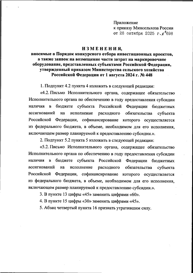 "О ВНЕСЕНИИ ИЗМЕНЕНИЙ В ПОРЯДОК КОНКУРСНОГО ОТБОРА ИНВЕСТИЦИОННЫХ ПРОЕКТОВ, А ТАКЖЕ ЗАЯВОК НА ВОЗМЕЩЕНИЕ ЧАСТИ ЗАТРАТ НА МАРКИРОВОЧНОЕ ОБОРУДОВАНИЕ, ПРЕДСТАВЛЕННЫХ СУБЪЕКТАМИ РОССИЙСКОЙ ФЕДЕРАЦИИ, УТВЕРЖДЕННЫЙ ПРИКАЗОМ МИНИСТЕРСТВА СЕЛЬСКОГО ХОЗЯЙСТВА РОССИЙСКОЙ ФЕДЕРАЦИИ ОТ 1 АВГУСТА 2024 Г. N 448"