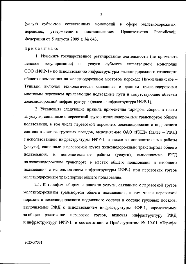 "ОБ ИЗМЕНЕНИИ ГОСУДАРСТВЕННОГО РЕГУЛИРОВАНИЯ ДЕЯТЕЛЬНОСТИ НА УСЛУГИ СУБЪЕКТА ЕСТЕСТВЕННОЙ МОНОПОЛИИ ООО "ИФР-1" ПО ИСПОЛЬЗОВАНИЮ ИНФРАСТРУКТУРЫ ЖЕЛЕЗНОДОРОЖНОГО ТРАНСПОРТА ОБЩЕГО ПОЛЬЗОВАНИЯ, ОБ УСТАНОВЛЕНИИ ПРАВИЛ ПРИМЕНЕНИЯ ТАРИФОВ, СБОРОВ И ПЛАТЫ ЗА УСЛУГИ, СВЯЗАННЫЕ С ПЕРЕВОЗКОЙ ГРУЗОВ ЖЕЛЕЗНОДОРОЖНЫМ ТРАНСПОРТОМ ОБЩЕГО ПОЛЬЗОВАНИЯ, В ТОМ ЧИСЛЕ ПЕРЕВОЗКОЙ ПОРОЖНЕГО ЖЕЛЕЗНОДОРОЖНОГО ПОДВИЖНОГО СОСТАВА В СОСТАВЕ ГРУЗОВЫХ ПОЕЗДОВ, ВЫПОЛНЯЕМЫЕ ОАО "РЖД" С ИСПОЛЬЗОВАНИЕМ ИНФРАСТРУКТУРЫ ООО "ИФР-1", И ЗА ДОПОЛНИТЕЛЬНЫЕ РАБОТЫ (УСЛУГИ), СВЯЗАННЫЕ С ПЕРЕВОЗКОЙ ГРУЗОВ ЖЕЛЕЗНОДОРОЖНЫМ ТРАНСПОРТОМ ОБЩЕГО ПОЛЬЗОВАНИЯ, И ДОПОЛНИТЕЛЬНЫЕ РАБОТЫ (УСЛУГИ), ВЫПОЛНЯЕМЫЕ ОАО "РЖД" НА ЖЕЛЕЗНОДОРОЖНОМ ТРАНСПОРТЕ В МЕСТАХ ОБЩЕГО ПОЛЬЗОВАНИЯ И НЕОБЩЕГО ПОЛЬЗОВАНИЯ С ИСПОЛЬЗОВАНИЕМ ИНФРАСТРУКТУРЫ ООО "ИФР-1" ПРИ ПЕРЕВОЗКАХ ГРУЗОВ ЖЕЛЕЗНОДОРОЖНЫМ ТРАНСПОРТОМ ОБЩЕГО ПОЛЬЗОВАНИЯ"