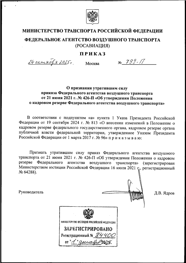ПРИКАЗ Росавиации от 24.10.2025 N 799-П
