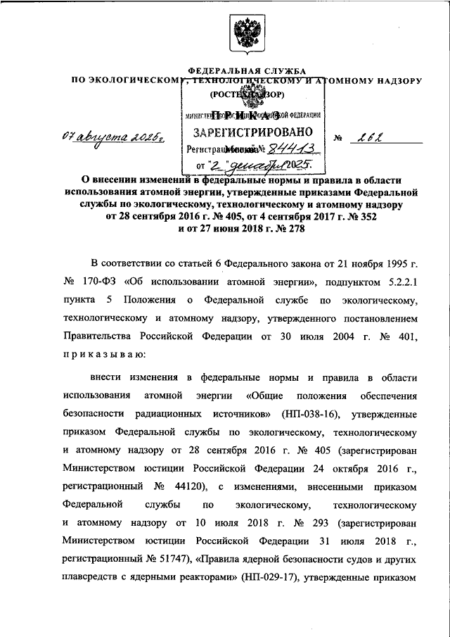 ПРИКАЗ Ростехнадзора от 07.08.2025 N 262