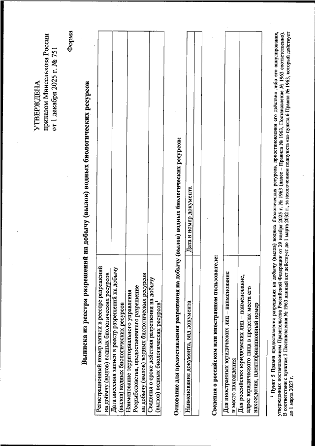 "ОБ УТВЕРЖДЕНИИ ФОРМЫ ВЫПИСКИ ИЗ РЕЕСТРА РАЗРЕШЕНИЙ НА ДОБЫЧУ (ВЫЛОВ) ВОДНЫХ БИОЛОГИЧЕСКИХ РЕСУРСОВ"