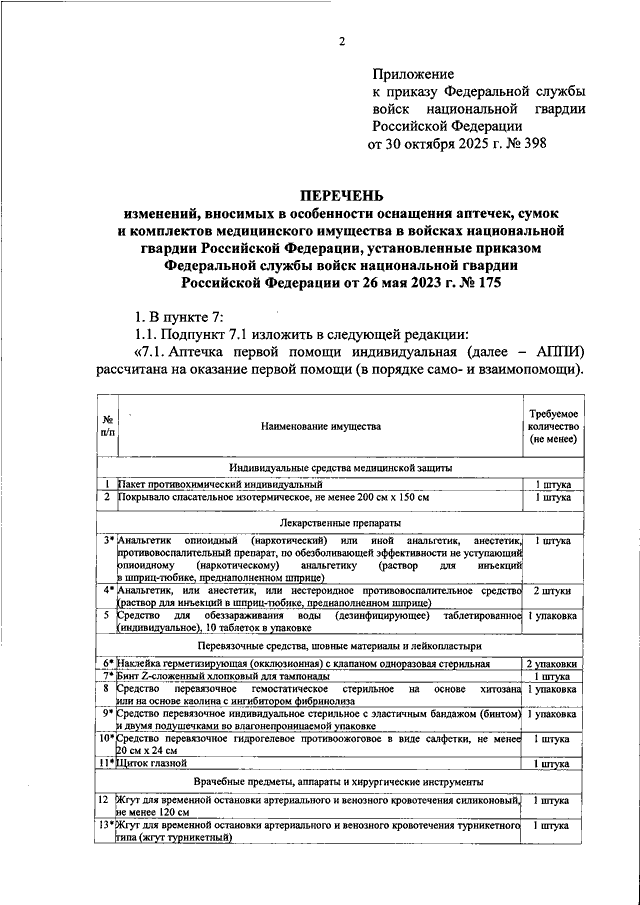 "О ВНЕСЕНИИ ИЗМЕНЕНИЙ В ОСОБЕННОСТИ ОСНАЩЕНИЯ АПТЕЧЕК, СУМОК И КОМПЛЕКТОВ МЕДИЦИНСКОГО ИМУЩЕСТВА В ВОЙСКАХ НАЦИОНАЛЬНОЙ ГВАРДИИ РОССИЙСКОЙ ФЕДЕРАЦИИ, УСТАНОВЛЕННЫЕ ПРИКАЗОМ ФЕДЕРАЛЬНОЙ СЛУЖБЫ ВОЙСК НАЦИОНАЛЬНОЙ ГВАРДИИ РОССИЙСКОЙ ФЕДЕРАЦИИ ОТ 26 МАЯ 2023 Г. N 175"