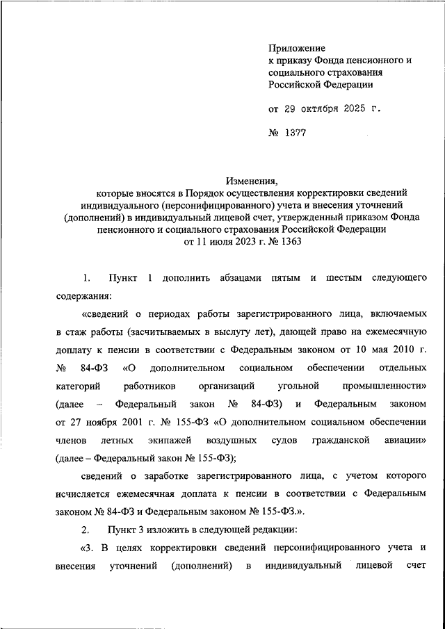 "О ВНЕСЕНИИ ИЗМЕНЕНИЙ В ПОРЯДОК ОСУЩЕСТВЛЕНИЯ КОРРЕКТИРОВКИ СВЕДЕНИЙ ИНДИВИДУАЛЬНОГО (ПЕРСОНИФИЦИРОВАННОГО) УЧЕТА И ВНЕСЕНИЯ УТОЧНЕНИЙ (ДОПОЛНЕНИЙ) В ИНДИВИДУАЛЬНЫЙ ЛИЦЕВОЙ СЧЕТ, УТВЕРЖДЕННЫЙ ПРИКАЗОМ ФОНДА ПЕНСИОННОГО И СОЦИАЛЬНОГО СТРАХОВАНИЯ РОССИЙСКОЙ ФЕДЕРАЦИИ ОТ 11 ИЮЛЯ 2023 Г. N 1363"