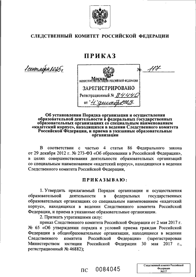 ПРИКАЗ Следственного комитета РФ от 01.09.2025 N 117