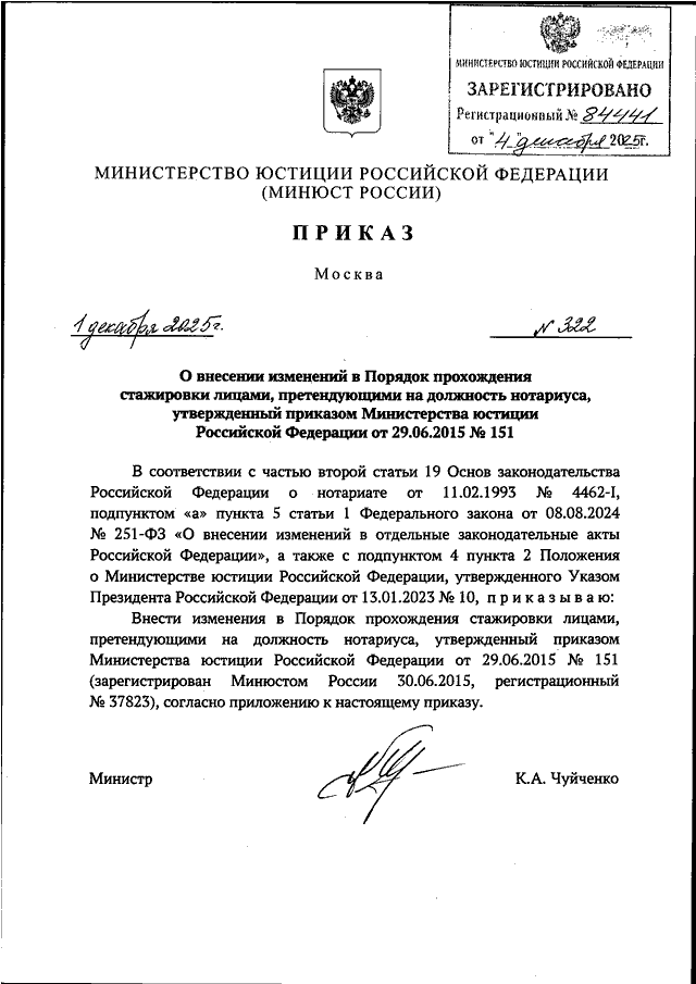 ПРИКАЗ Минюста РФ от 01.12.2025 N 322