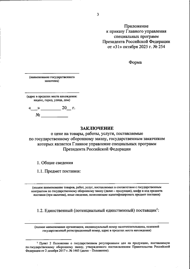 "ОБ УСТАНОВЛЕНИИ ФОРМЫ ЗАКЛЮЧЕНИЯ О ЦЕНЕ НА ТОВАРЫ, РАБОТЫ, УСЛУГИ, ПОСТАВЛЯЕМЫЕ ПО ГОСУДАРСТВЕННОМУ ОБОРОННОМУ ЗАКАЗУ, ГОСУДАРСТВЕННЫМ ЗАКАЗЧИКОМ КОТОРЫХ ЯВЛЯЕТСЯ ГЛАВНОЕ УПРАВЛЕНИЕ СПЕЦИАЛЬНЫХ ПРОГРАММ ПРЕЗИДЕНТА РОССИЙСКОЙ ФЕДЕРАЦИИ"