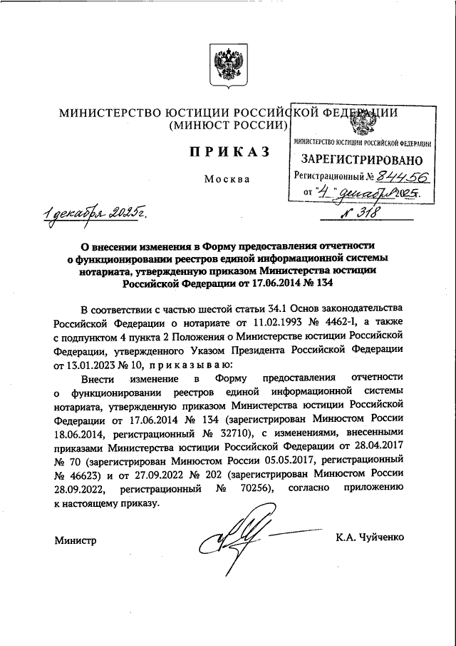 ПРИКАЗ Минюста РФ от 01.12.2025 N 318