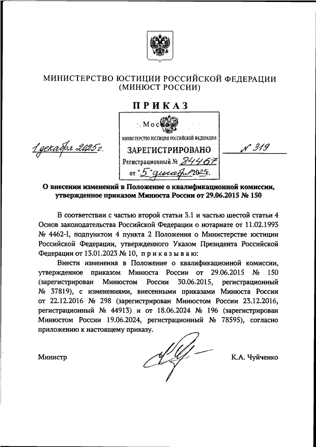 ПРИКАЗ Минюста РФ от 01.12.2025 N 319