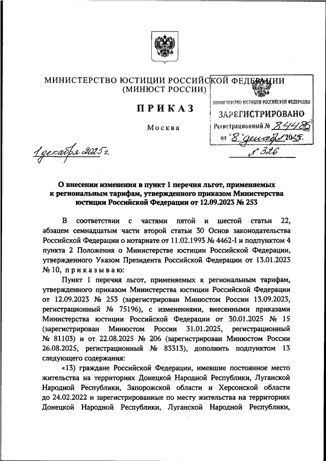 ПРИКАЗ Минюста РФ от 01.12.2025 N 326