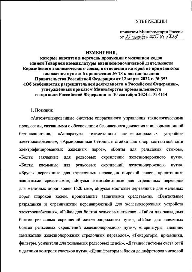 "О ВНЕСЕНИИ ИЗМЕНЕНИЙ В ПЕРЕЧЕНЬ ПРОДУКЦИИ С УКАЗАНИЕМ КОДОВ ЕДИНОЙ ТОВАРНОЙ НОМЕНКЛАТУРЫ ВНЕШНЕЭКОНОМИЧЕСКОЙ ДЕЯТЕЛЬНОСТИ ЕВРАЗИЙСКОГО ЭКОНОМИЧЕСКОГО СОЮЗА, В ОТНОШЕНИИ КОТОРОЙ НЕ ПРИМЕНЯЮТСЯ ПОЛОЖЕНИЯ ПУНКТА 6 ПРИЛОЖЕНИЯ N 18 К ПОСТАНОВЛЕНИЮ ПРАВИТЕЛЬСТВА РОССИЙСКОЙ ФЕДЕРАЦИИ ОТ 12 МАРТА 2022 Г. N 353 "ОБ ОСОБЕННОСТЯХ РАЗРЕШИТЕЛЬНОЙ ДЕЯТЕЛЬНОСТИ В РОССИЙСКОЙ ФЕДЕРАЦИИ", УТВЕРЖДЕННЫЙ ПРИКАЗОМ МИНИСТЕРСТВА ПРОМЫШЛЕННОСТИ И ТОРГОВЛИ РОССИЙСКОЙ ФЕДЕРАЦИИ ОТ 10 СЕНТЯБРЯ 2024 Г. N 41142"
