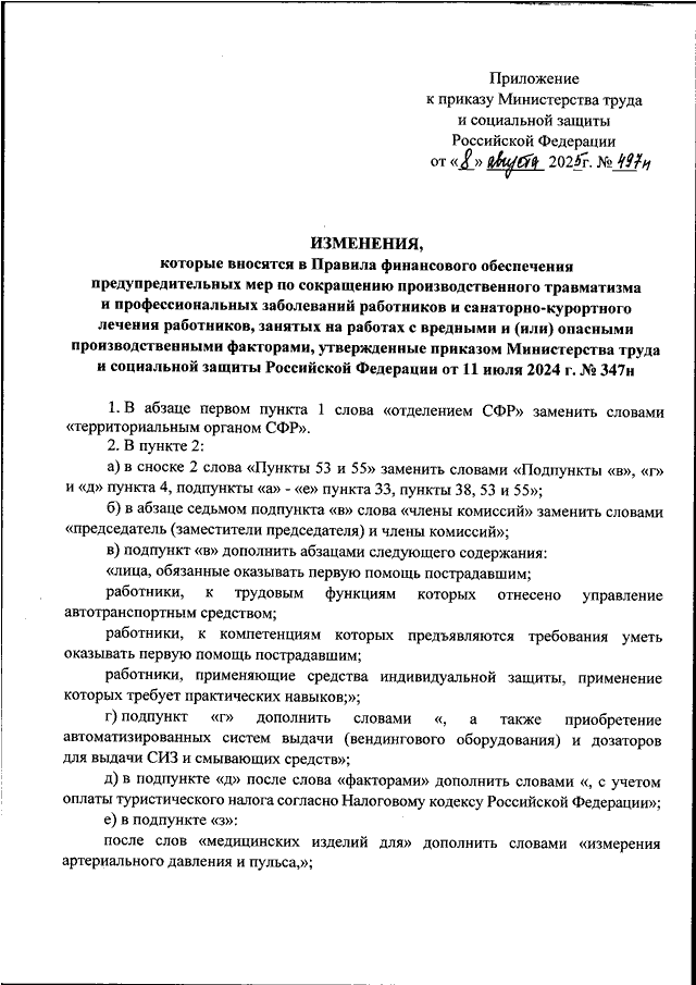 "О ВНЕСЕНИИ ИЗМЕНЕНИЙ В ПРАВИЛА ФИНАНСОВОГО ОБЕСПЕЧЕНИЯ ПРЕДУПРЕДИТЕЛЬНЫХ МЕР ПО СОКРАЩЕНИЮ ПРОИЗВОДСТВЕННОГО ТРАВМАТИЗМА И ПРОФЕССИОНАЛЬНЫХ ЗАБОЛЕВАНИЙ РАБОТНИКОВ И САНАТОРНО - КУРОРТНОГО ЛЕЧЕНИЯ РАБОТНИКОВ, ЗАНЯТЫХ НА РАБОТАХ С ВРЕДНЫМИ И (ИЛИ) ОПАСНЫМИ ПРОИЗВОДСТВЕННЫМИ ФАКТОРАМИ, УТВЕРЖДЕННЫЕ ПРИКАЗОМ МИНИСТЕРСТВА ТРУДА И СОЦИАЛЬНОЙ ЗАЩИТЫ РОССИЙСКОЙ ФЕДЕРАЦИИ ОТ 11 ИЮЛЯ 2024 Г. N 347Н"