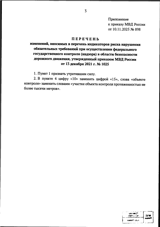 "О ВНЕСЕНИИ ИЗМЕНЕНИЙ В ПЕРЕЧЕНЬ ИНДИКАТОРОВ РИСКА НАРУШЕНИЯ ОБЯЗАТЕЛЬНЫХ ТРЕБОВАНИЙ ПРИ ОСУЩЕСТВЛЕНИИ ФЕДЕРАЛЬНОГО ГОСУДАРСТВЕННОГО КОНТРОЛЯ (НАДЗОРА) В ОБЛАСТИ БЕЗОПАСНОСТИ ДОРОЖНОГО ДВИЖЕНИЯ, УТВЕРЖДЕННЫЙ ПРИКАЗОМ МВД РОССИИ ОТ 13 ДЕКАБРЯ 2021 Г. N 1025"