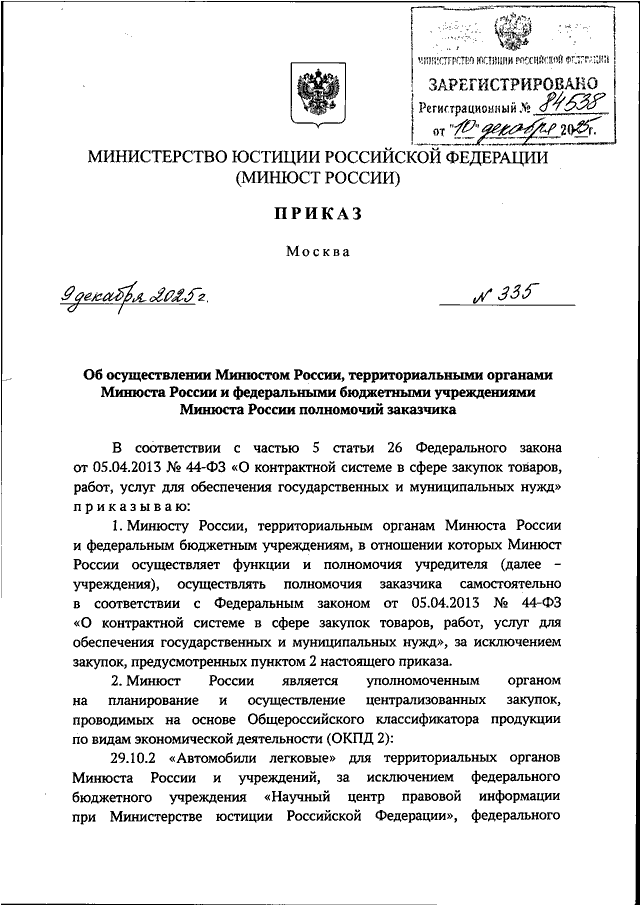 ПРИКАЗ Минюста РФ от 09.12.2025 N 335