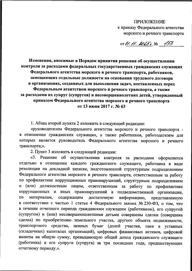 "О ВНЕСЕНИИ ИЗМЕНЕНИЙ В ПОРЯДОК ПРИНЯТИЯ РЕШЕНИЯ ОБ ОСУЩЕСТВЛЕНИИ КОНТРОЛЯ ЗА РАСХОДАМИ ФЕДЕРАЛЬНЫХ ГОСУДАРСТВЕННЫХ ГРАЖДАНСКИХ СЛУЖАЩИХ ФЕДЕРАЛЬНОГО АГЕНТСТВА МОРСКОГО И РЕЧНОГО ТРАНСПОРТА, РАБОТНИКОВ, ЗАМЕЩАЮЩИХ ОТДЕЛЬНЫЕ ДОЛЖНОСТИ НА ОСНОВАНИИ ТРУДОВОГО ДОГОВОРА В ОРГАНИЗАЦИЯХ, СОЗДАННЫХ ДЛЯ ВЫПОЛНЕНИЯ ЗАДАЧ, ПОСТАВЛЕННЫХ ПЕРЕД ФЕДЕРАЛЬНЫМ АГЕНТСТВОМ МОРСКОГО И РЕЧНОГО ТРАНСПОРТА, А ТАКЖЕ ЗА РАСХОДАМИ ИХ СУПРУГ (СУПРУГОВ) И НЕСОВЕРШЕННОЛЕТНИХ ДЕТЕЙ, УТВЕРЖДЕННЫЙ ПРИКАЗОМ ФЕДЕРАЛЬНОГО АГЕНТСТВА МОРСКОГО И РЕЧНОГО ТРАНСПОРТА ОТ 13 ИЮНЯ 2017 Г. N 63"