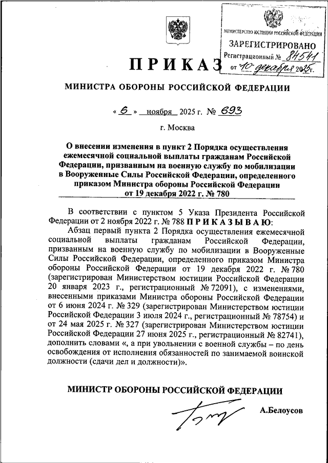 ПРИКАЗ Минобороны РФ от 06.11.2025 N 693