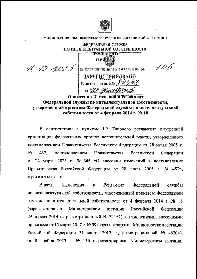 ПРИКАЗ Роспатента от 14.10.2025 N 105
