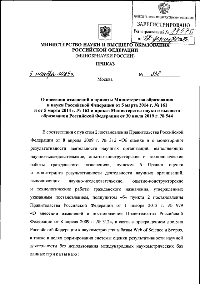 ПРИКАЗ Минобрнауки РФ от 05.11.2025 N 838