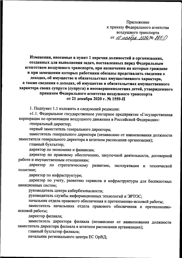 "О ВНЕСЕНИИ ИЗМЕНЕНИЙ В ПУНКТ 1 ПЕРЕЧНЯ ДОЛЖНОСТЕЙ В ОРГАНИЗАЦИЯХ, СОЗДАННЫХ ДЛЯ ВЫПОЛНЕНИЯ ЗАДАЧ, ПОСТАВЛЕННЫХ ПЕРЕД ФЕДЕРАЛЬНЫМ АГЕНТСТВОМ ВОЗДУШНОГО ТРАНСПОРТА, ПРИ НАЗНАЧЕНИИ НА КОТОРЫЕ ГРАЖДАНЕ И ПРИ ЗАМЕЩЕНИИ КОТОРЫХ РАБОТНИКИ ОБЯЗАНЫ ПРЕДСТАВЛЯТЬ СВЕДЕНИЯ О ДОХОДАХ, ОБ ИМУЩЕСТВЕ И ОБЯЗАТЕЛЬСТВАХ ИМУЩЕСТВЕННОГО ХАРАКТЕРА, А ТАКЖЕ СВЕДЕНИЯ О ДОХОДАХ, ОБ ИМУЩЕСТВЕ И ОБЯЗАТЕЛЬСТВАХ ИМУЩЕСТВЕННОГО ХАРАКТЕРА СВОИХ СУПРУГИ (СУПРУГА) И НЕСОВЕРШЕННОЛЕТНИХ ДЕТЕЙ, УТВЕРЖДЕННОГО ПРИКАЗОМ ФЕДЕРАЛЬНОГО АГЕНТСТВА ВОЗДУШНОГО ТРАНСПОРТА ОТ 21 ДЕКАБРЯ 2020 Г. N 1559-П"