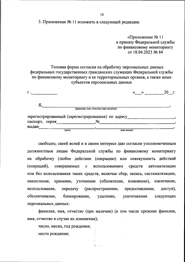"О ВНЕСЕНИИ ИЗМЕНЕНИЙ В ПРИЛОЖЕНИЯ N 1, N 6 И N 11 К ПРИКАЗУ ФЕДЕРАЛЬНОЙ СЛУЖБЫ ПО ФИНАНСОВОМУ МОНИТОРИНГУ ОТ 18 АПРЕЛЯ 2023 Г. N 84 "ОБ ОРГАНИЗАЦИИ РАБОТЫ С ПЕРСОНАЛЬНЫМИ ДАННЫМИ В ФЕДЕРАЛЬНОЙ СЛУЖБЕ ПО ФИНАНСОВОМУ МОНИТОРИНГУ И ЕЕ ТЕРРИТОРИАЛЬНЫХ ОРГАНАХ"