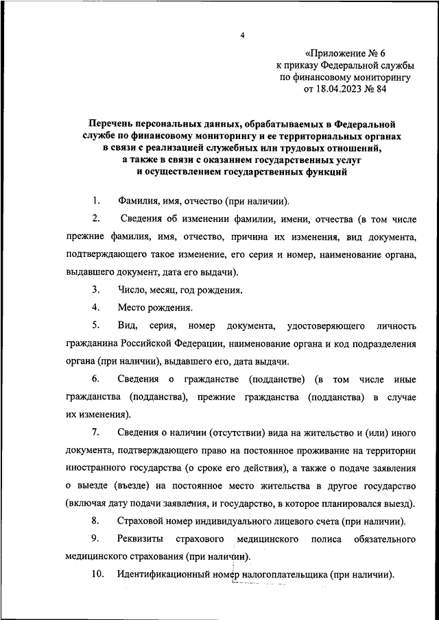 "О ВНЕСЕНИИ ИЗМЕНЕНИЙ В ПРИЛОЖЕНИЯ N 1, N 6 И N 11 К ПРИКАЗУ ФЕДЕРАЛЬНОЙ СЛУЖБЫ ПО ФИНАНСОВОМУ МОНИТОРИНГУ ОТ 18 АПРЕЛЯ 2023 Г. N 84 "ОБ ОРГАНИЗАЦИИ РАБОТЫ С ПЕРСОНАЛЬНЫМИ ДАННЫМИ В ФЕДЕРАЛЬНОЙ СЛУЖБЕ ПО ФИНАНСОВОМУ МОНИТОРИНГУ И ЕЕ ТЕРРИТОРИАЛЬНЫХ ОРГАНАХ"