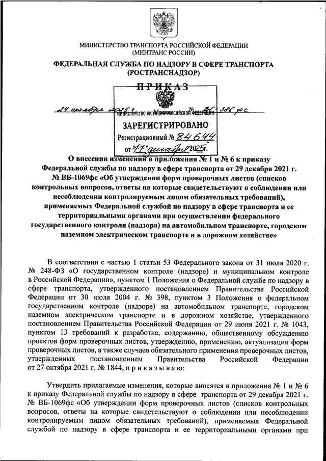 "О ВНЕСЕНИИ ИЗМЕНЕНИЙ В ПРИЛОЖЕНИЯ N 1 И N 6 К ПРИКАЗУ ФЕДЕРАЛЬНОЙ СЛУЖБЫ ПО НАДЗОРУ В СФЕРЕ ТРАНСПОРТА ОТ 29 ДЕКАБРЯ 2021 Г. N ВБ-1069ФС "ОБ УТВЕРЖДЕНИИ ФОРМ ПРОВЕРОЧНЫХ ЛИСТОВ (СПИСКОВ КОНТРОЛЬНЫХ ВОПРОСОВ, ОТВЕТЫ НА КОТОРЫЕ СВИДЕТЕЛЬСТВУЮТ О СОБЛЮДЕНИИ ИЛИ НЕСОБЛЮДЕНИИ КОНТРОЛИРУЕМЫМ ЛИЦОМ ОБЯЗАТЕЛЬНЫХ ТРЕБОВАНИЙ), ПРИМЕНЯЕМЫХ ФЕДЕРАЛЬНОЙ СЛУЖБОЙ ПО НАДЗОРУ В СФЕРЕ ТРАНСПОРТА И ЕЕ ТЕРРИТОРИАЛЬНЫМИ ОРГАНАМИ ПРИ ОСУЩЕСТВЛЕНИИ ФЕДЕРАЛЬНОГО ГОСУДАРСТВЕННОГО КОНТРОЛЯ (НАДЗОРА) НА АВТОМОБИЛЬНОМ ТРАНСПОРТЕ, ГОРОДСКОМ НАЗЕМНОМ ЭЛЕКТРИЧЕСКОМ ТРАНСПОРТЕ И В ДОРОЖНОМ ХОЗЯЙСТВЕ"