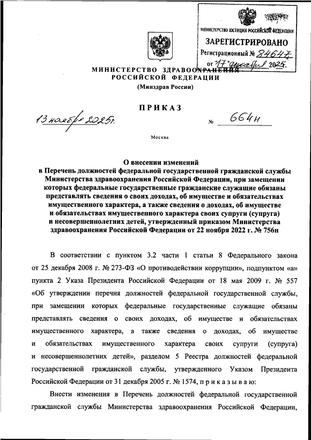 ПРИКАЗ Минздрава РФ от 13.11.2025 N 664н