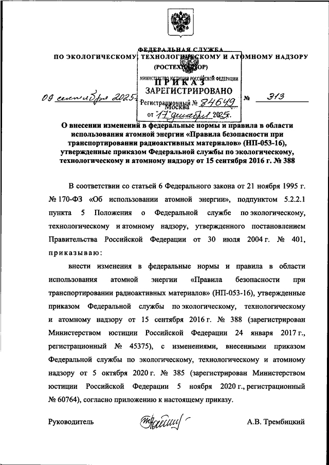 "О ВНЕСЕНИИ ИЗМЕНЕНИЙ В ФЕДЕРАЛЬНЫЕ НОРМЫ И ПРАВИЛА В ОБЛАСТИ ИСПОЛЬЗОВАНИЯ АТОМНОЙ ЭНЕРГИИ "ПРАВИЛА БЕЗОПАСНОСТИ ПРИ ТРАНСПОРТИРОВАНИИ РАДИОАКТИВНЫХ МАТЕРИАЛОВ" (НП-053-16), УТВЕРЖДЕННЫЕ ПРИКАЗОМ ФЕДЕРАЛЬНОЙ СЛУЖБЫ ПО ЭКОЛОГИЧЕСКОМУ, ТЕХНОЛОГИЧЕСКОМУ И АТОМНОМУ НАДЗОРУ ОТ 15 СЕНТЯБРЯ 2016 Г. N 388"