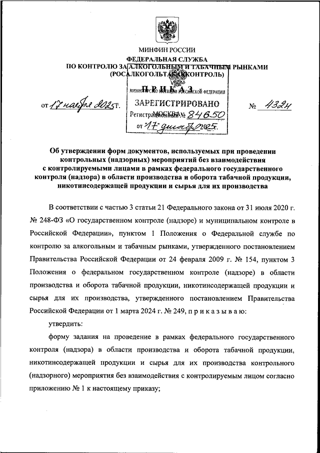 ПРИКАЗ Росалкогольтабакконтроля от 17.11.2025 N 432н