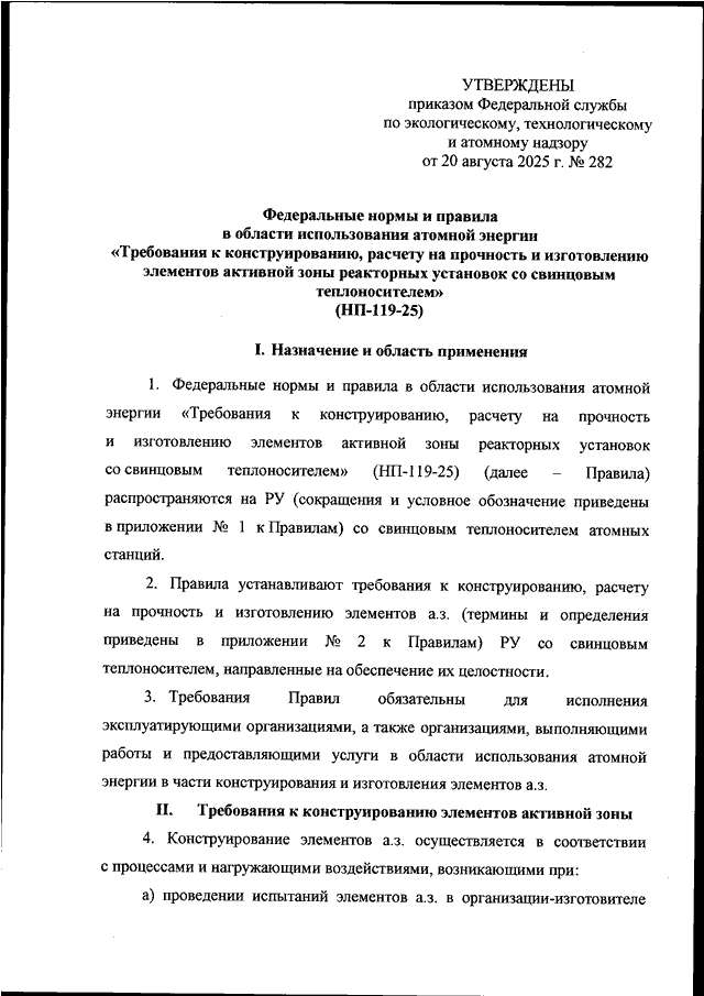 "ОБ УТВЕРЖДЕНИИ ФЕДЕРАЛЬНЫХ НОРМ И ПРАВИЛ В ОБЛАСТИ ИСПОЛЬЗОВАНИЯ АТОМНОЙ ЭНЕРГИИ "ТРЕБОВАНИЯ К КОНСТРУИРОВАНИЮ, РАСЧЕТУ НА ПРОЧНОСТЬ И ИЗГОТОВЛЕНИЮ ЭЛЕМЕНТОВ АКТИВНОЙ ЗОНЫ РЕАКТОРНЫХ УСТАНОВОК СО СВИНЦОВЫМ ТЕПЛОНОСИТЕЛЕМ" (НП-119-25)"