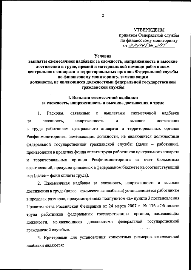 "ОБ УТВЕРЖДЕНИИ УСЛОВИЙ ВЫПЛАТЫ ЕЖЕМЕСЯЧНОЙ НАДБАВКИ ЗА СЛОЖНОСТЬ, НАПРЯЖЕННОСТЬ И ВЫСОКИЕ ДОСТИЖЕНИЯ В ТРУДЕ, ПРЕМИЙ И МАТЕРИАЛЬНОЙ ПОМОЩИ РАБОТНИКАМ ЦЕНТРАЛЬНОГО АППАРАТА И ТЕРРИТОРИАЛЬНЫХ ОРГАНОВ ФЕДЕРАЛЬНОЙ СЛУЖБЫ ПО ФИНАНСОВОМУ МОНИТОРИНГУ, ЗАМЕЩАЮЩИМ ДОЛЖНОСТИ, НЕ ЯВЛЯЮЩИЕСЯ ДОЛЖНОСТЯМИ ФЕДЕРАЛЬНОЙ ГОСУДАРСТВЕННОЙ ГРАЖДАНСКОЙ СЛУЖБЫ"