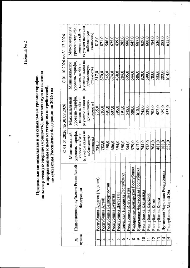 "О ПРЕДЕЛЬНЫХ МИНИМАЛЬНЫХ И МАКСИМАЛЬНЫХ УРОВНЯХ ТАРИФОВ НА ЭЛЕКТРИЧЕСКУЮ ЭНЕРГИЮ (МОЩНОСТЬ), ПОСТАВЛЯЕМУЮ НАСЕЛЕНИЮ И ПРИРАВНЕННЫМ К НЕМУ КАТЕГОРИЯМ ПОТРЕБИТЕЛЕЙ, ПО СУБЪЕКТАМ РОССИЙСКОЙ ФЕДЕРАЦИИ НА 2026 ГОД"