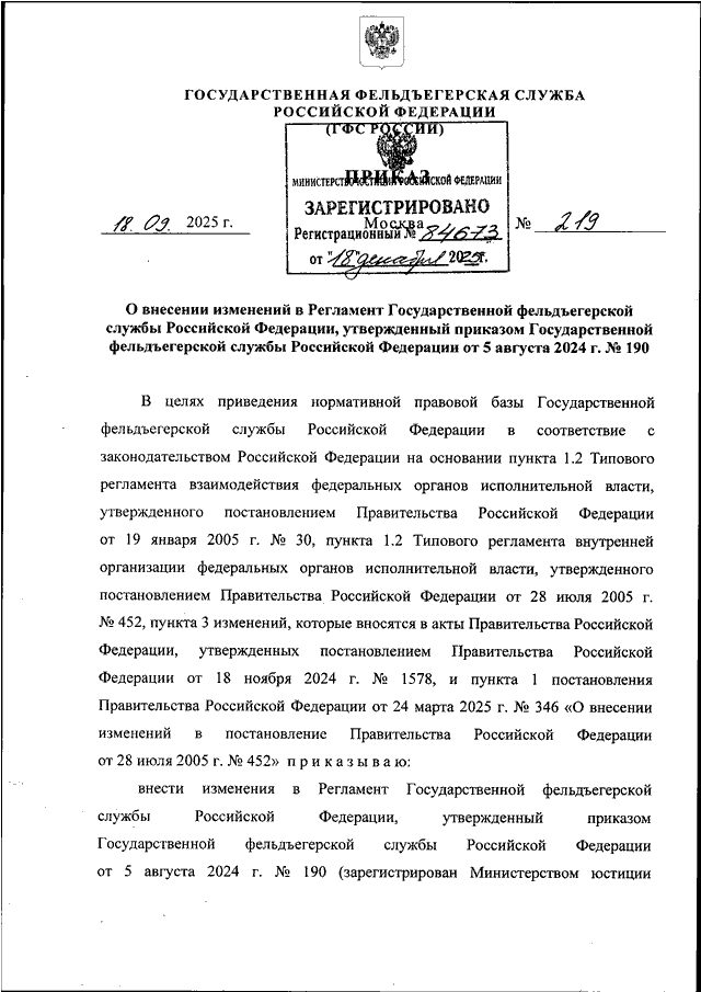 ПРИКАЗ ГФС РФ от 18.09.2025 N 219
