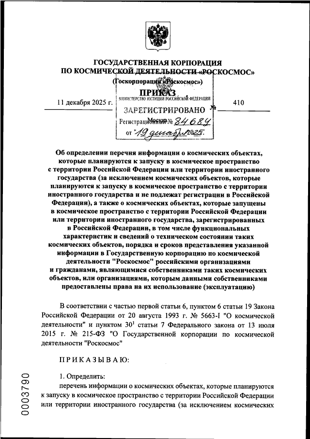 "Роскосмос" от 11.12.2025 N 410 "ОБ ОПРЕДЕЛЕНИИ ПЕРЕЧНЯ ИНФОРМАЦИИ О КОСМИЧЕСКИХ ОБЪЕКТАХ, КОТОРЫЕ ПЛАНИРУЮТСЯ К ЗАПУСКУ В КОСМИЧЕСКОЕ ПРОСТРАНСТВО С ТЕРРИТОРИИ РОССИЙСКОЙ ФЕДЕРАЦИИ ИЛИ ТЕРРИТОРИИ ИНОСТРАННОГО ГОСУДАРСТВА (ЗА ИСКЛЮЧЕНИЕМ КОСМИЧЕСКИХ ОБЪЕКТОВ, КОТОРЫЕ ПЛАНИРУЮТСЯ К ЗАПУСКУ В КОСМИЧЕСКОЕ ПРОСТРАНСТВО С ТЕРРИТОРИИ ИНОСТРАННОГО ГОСУДАРСТВА И НЕ ПОДЛЕЖАТ РЕГИСТРАЦИИ В РОССИЙСКОЙ ФЕДЕРАЦИИ), А ТАКЖЕ О КОСМИЧЕСКИХ ОБЪЕКТАХ, КОТОРЫЕ ЗАПУЩЕНЫ В КОСМИЧЕСКОЕ ПРОСТРАНСТВО С ТЕРРИТОРИИ РОССИЙСКОЙ ФЕДЕРАЦИИ ИЛИ ТЕРРИТОРИИ ИНОСТРАННОГО ГОСУДАРСТВА, ЗАРЕГИСТРИРОВАННЫХ В РОССИЙСКОЙ ФЕДЕРАЦИИ, В ТОМ ЧИСЛЕ ФУНКЦИОНАЛЬНЫХ ХАРАКТЕРИСТИК И СВЕДЕНИИ О ТЕХНИЧЕСКОМ СОСТОЯНИИ ТАКИХ КОСМИЧЕСКИХ ОБЪЕКТОВ, ПОРЯДКА И СРОКОВ ПРЕДСТАВЛЕНИЯ УКАЗАННОЙ ИНФОРМАЦИИ В ГОСУДАРСТВЕННУЮ КОРПОРАЦИЮ ПО КОСМИЧЕСКОЙ ДЕЯТЕЛЬНОСТИ "РОСКОСМОС" РОССИЙСКИМИ ОРГАНИЗАЦИЯМИ И ГРАЖДАНАМИ, ЯВЛЯЮЩИМИСЯ СОБСТВЕННИКАМИ ТАКИХ КОСМИЧЕСКИХ ОБЪЕКТОВ, ИЛИ ОРГАНИЗАЦИЯМИ, КОТОРЫМ ДАННЫМИ СОБСТВЕННИКАМИ ПРЕДОСТАВЛЕНЫ ПРАВА НА ИХ ИСПОЛЬЗОВАНИЕ (ЭКСПЛУАТАЦИЮ)"
