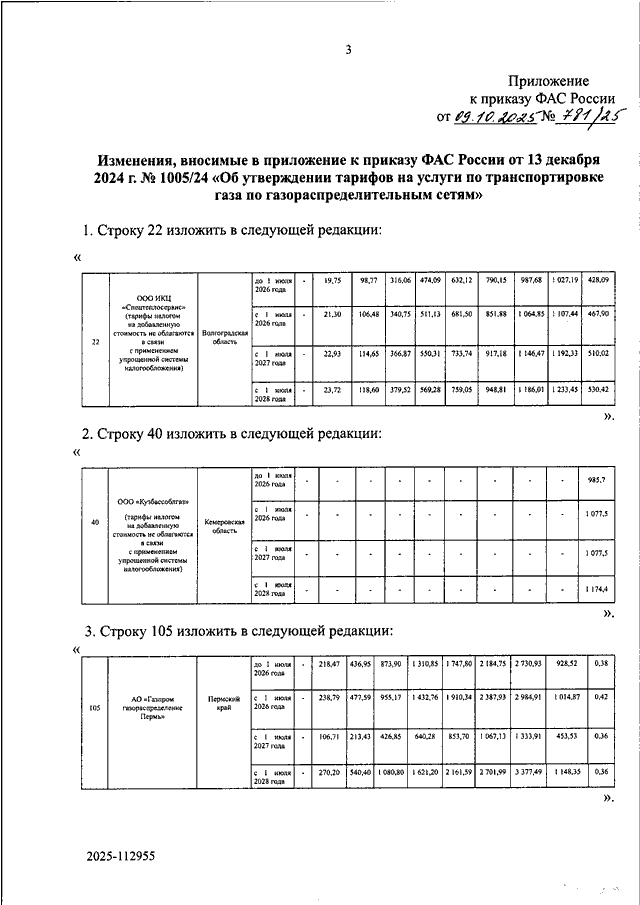 "О ВНЕСЕНИИ ИЗМЕНЕНИЙ В ПРИЛОЖЕНИЕ К ПРИКАЗУ ФАС РОССИИ ОТ 13 ДЕКАБРЯ 2024 Г. N 1005/24 "ОБ УТВЕРЖДЕНИИ ТАРИФОВ НА УСЛУГИ ПО ТРАНСПОРТИРОВКЕ ГАЗА ПО ГАЗОРАСПРЕДЕЛИТЕЛЬНЫМ СЕТЯМ"
