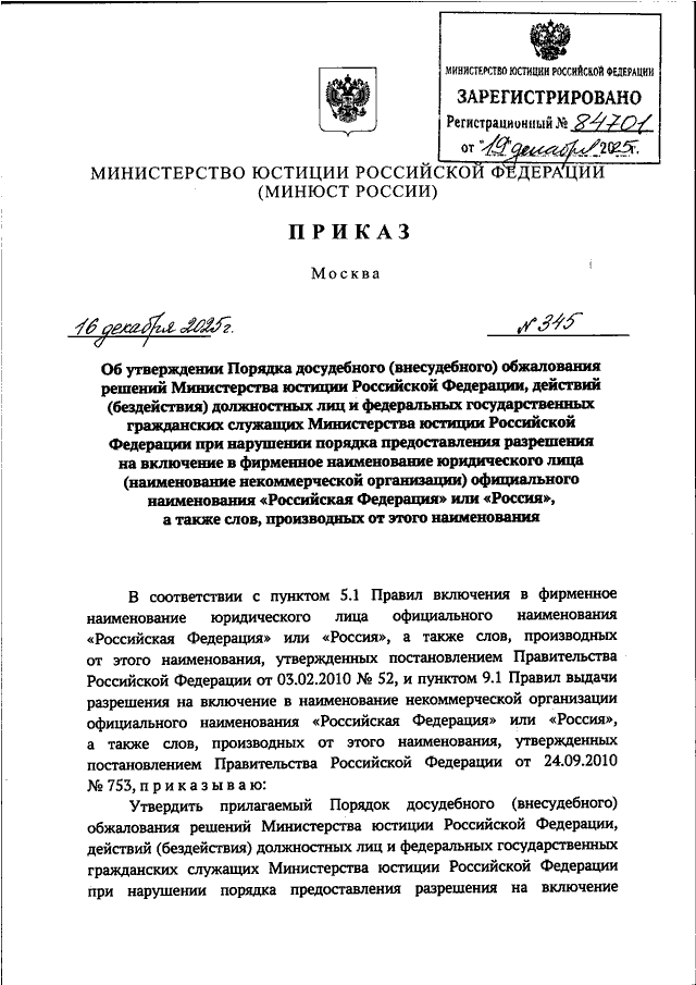 ПРИКАЗ Минюста РФ от 16.12.2025 N 345