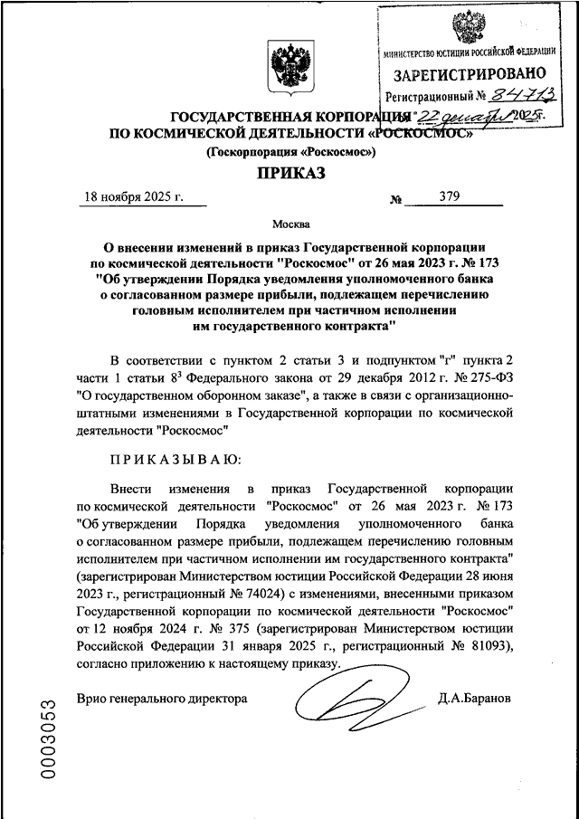 КОСМИЧЕСКОЙ ДЕЯТЕЛЬНОСТИ "РОСКОСМОС" ОТ 26 МАЯ 2023 Г. N 173 "ОБ