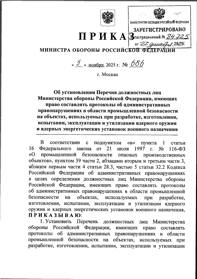ПРИКАЗ Минобороны РФ от 05.11.2025 N 686