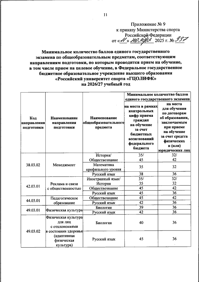 "ОБ УСТАНОВЛЕНИИ МИНИМАЛЬНОГО КОЛИЧЕСТВА БАЛЛОВ ЕДИНОГО ГОСУДАРСТВЕННОГО ЭКЗАМЕНА ПО ОБЩЕОБРАЗОВАТЕЛЬНЫМ ПРЕДМЕТАМ, СООТВЕТСТВУЮЩИМ НАПРАВЛЕНИЯМ ПОДГОТОВКИ, ПО КОТОРЫМ ПРОВОДИТСЯ ПРИЕМ НА ОБУЧЕНИЕ, В ТОМ ЧИСЛЕ ПРИЕМ НА ЦЕЛЕВОЕ ОБУЧЕНИЕ, В ОБРАЗОВАТЕЛЬНЫЕ ОРГАНИЗАЦИИ ВЫСШЕГО ОБРАЗОВАНИЯ, ПОДВЕДОМСТВЕННЫЕ МИНИСТЕРСТВУ СПОРТА РОССИЙСКОЙ ФЕДЕРАЦИИ, НА 2026/27 УЧЕБНЫЙ ГОД"