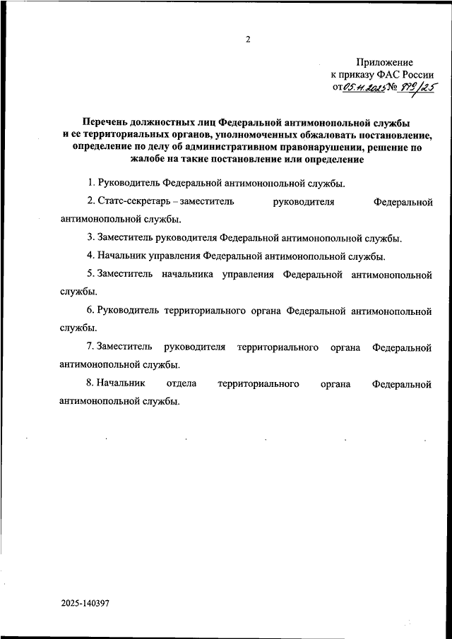 "ОБ УТВЕРЖДЕНИИ ПЕРЕЧНЯ ДОЛЖНОСТНЫХ ЛИЦ ФЕДЕРАЛЬНОЙ АНТИМОНОПОЛЬНОЙ СЛУЖБЫ И ЕЕ ТЕРРИТОРИАЛЬНЫХ ОРГАНОВ, УПОЛНОМОЧЕННЫХ ОБЖАЛОВАТЬ ПОСТАНОВЛЕНИЕ, ОПРЕДЕЛЕНИЕ ПО ДЕЛУ ОБ АДМИНИСТРАТИВНОМ ПРАВОНАРУШЕНИИ, РЕШЕНИЕ ПО ЖАЛОБЕ НА ТАКИЕ ПОСТАНОВЛЕНИЕ ИЛИ ОПРЕДЕЛЕНИЕ"